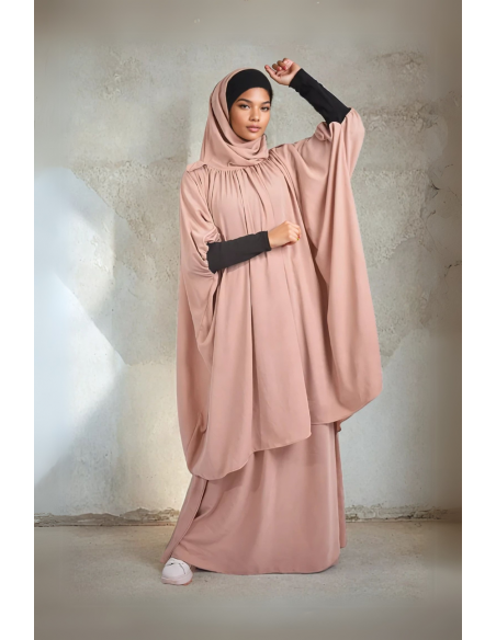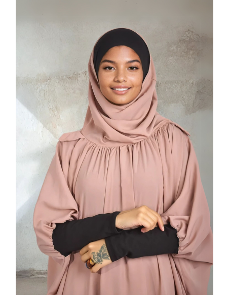 Discreet shades, a Wool peach fabric, refined details are the recipe of this new integrated hijab line: