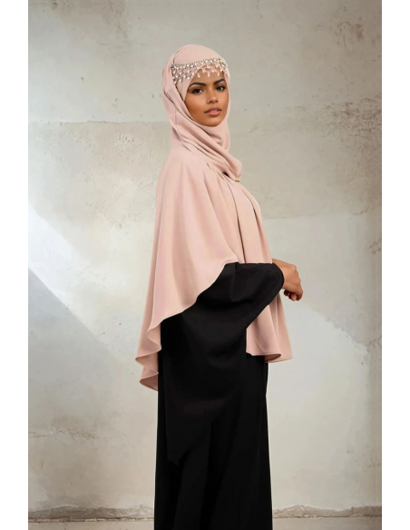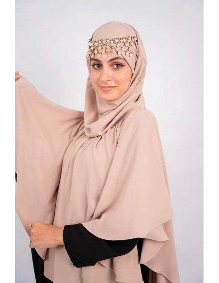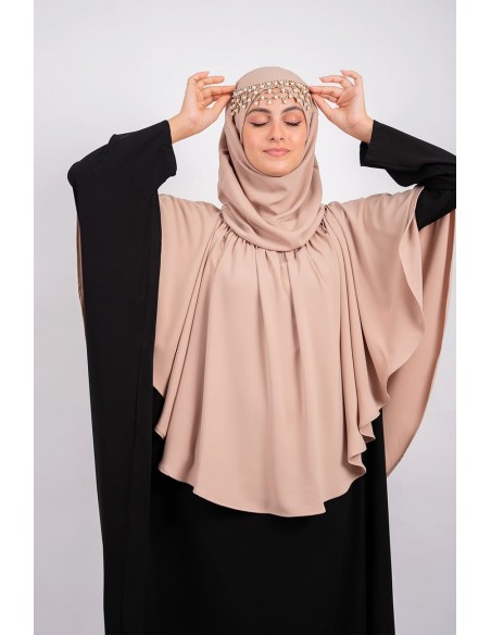 - The bandeau is integrated in the khimar and is tied at the neck