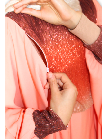 Specially designed for young mothers, this abaya is equipped with two invisible zippers, allowing practical and discreet access for breastfeeding. You can nourish your baby with ease while maintaining your elegance.