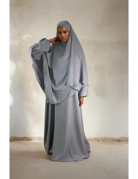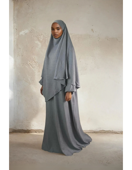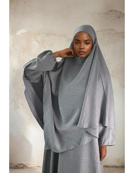 Pensé pour les femmes en quête de pudeur élégante et de confort structuré, Nayla Essentia associe une abaya fluide à un khimar en pointe à la coupe raffinée.