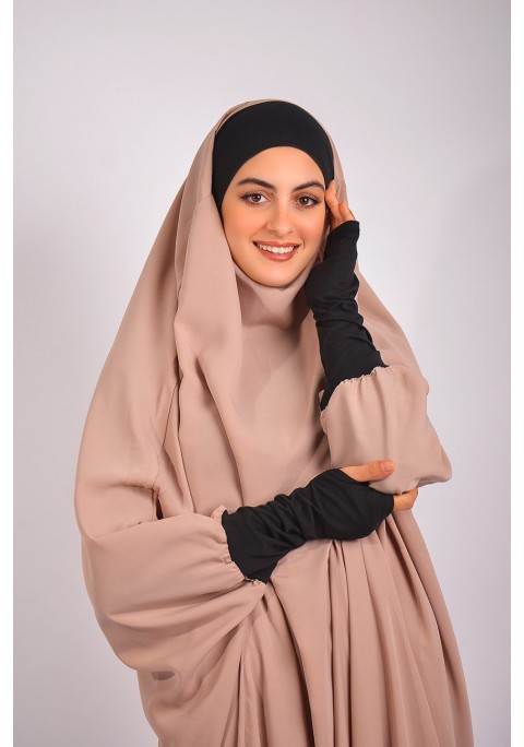 - Manches mitaines intégrées et cousues au jilbab : Pour un look harmonieux et une fonctionnalité accrue, ces manches offrent confort et praticité, vous permettant de bouger librement tout en restant élégante.